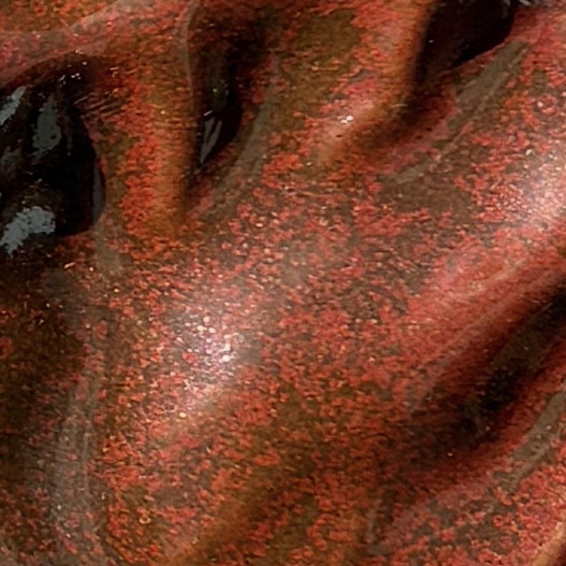 光沢があり、褐色がかった落ち着きのある赤色で、赤と茶褐色による不均一な斑紋も特徴です。