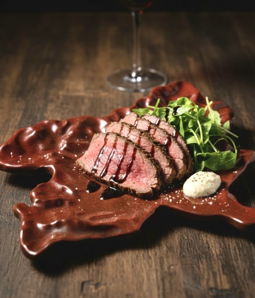 肉のミディアムレアな断面の赤を、鉄赤の器が同系色で包み込み、より深く、魅惑的な美味しさへと昇華させます。